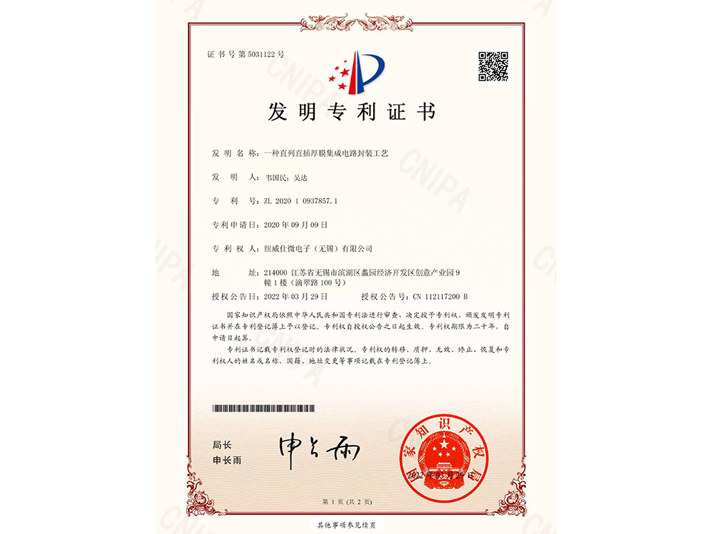 一种直列直插厚膜集成电路封装工艺发明专利证书