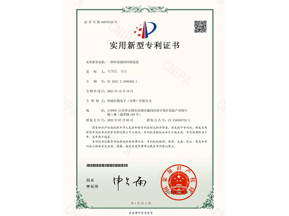 一种焊膏钢网印刷装置实用新型专利证书