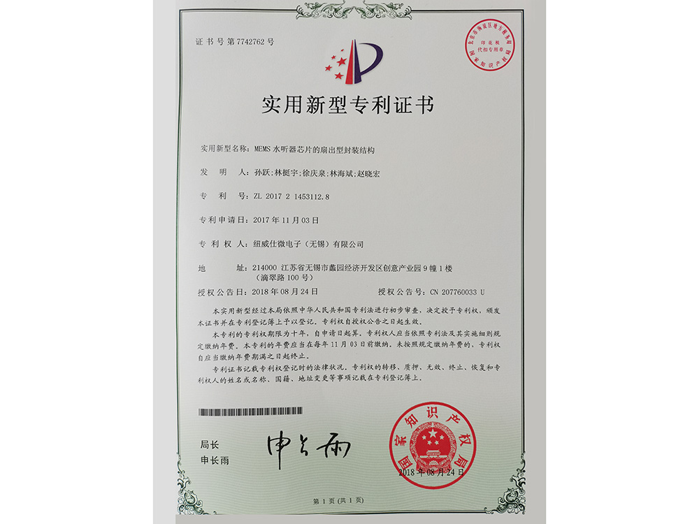 MEMS水听器芯片的扇出型封装结构实用新型专利证书