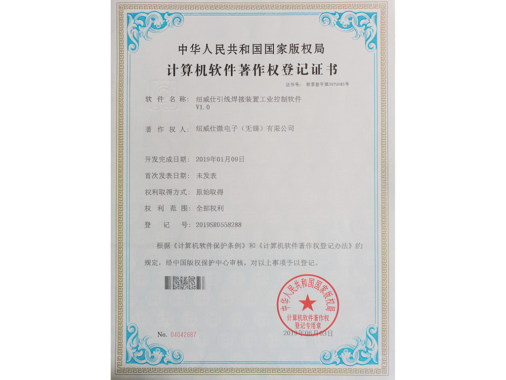 纽威仕引线焊接装置工业控制软件著作权登记证书
